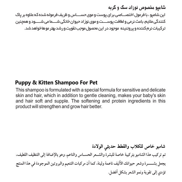کنندگی ملایم، باعث نرمی و لطافت پوست و موي نوزاد حیوان خانگی شما می شود و همچنین