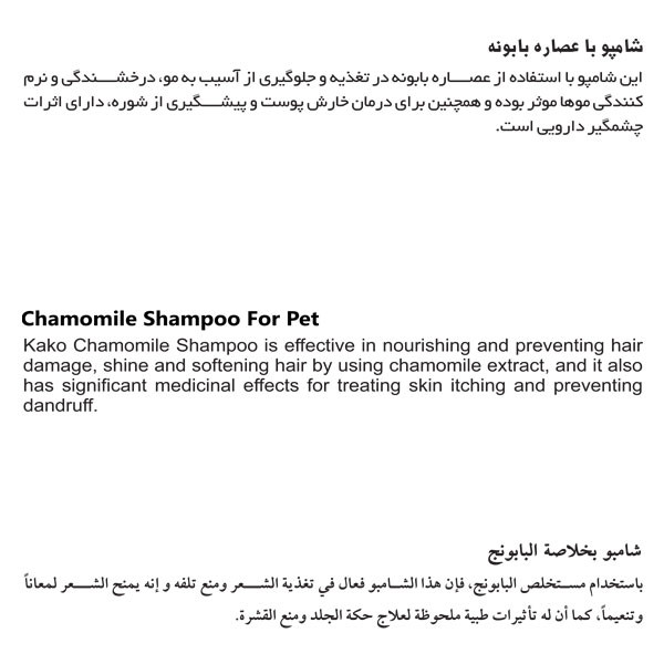 این شامپو با استفاده از عصاره بابونه در تغذیه و جلوگیري از آسیب به مو، درخشندگی و نرم کنندگی موها موثر بوده و همچنین براي درمان خارش پوست و پیشگیري از شوره، داراي اثرات چشمگیر دارویی است.