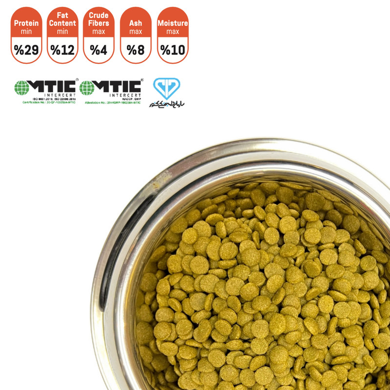 پروتئیــن طیــور، کنســانتره پروتئینــی گیاهــی، گلوتــن ذرت، پــودر ماهــی، برنــج، نشاســته ســیب زمینــی، آرد گنــدم، ذرت، چغنــدر (قندگیــری شــده)، پــودر جلبــک دریایــی، مخمــر هیدرولیــز شــده (منبــع مانــان الیگــو ســاکارید و بتاگلــوکان)، چربــی طیــور، روغــن ماهــی، روغــن ســویا، لســیتین، یــوکا، پســیلیوم، مکمــل معدنــی، مکمــل ویتامینــه، ال-کارنیتیــن، توریــن، کولیــن کلرایــد، مکمــل اســید آمینــه، کلینوپتیولیــت میکرونیــزه، عصاره های گیاهی، اسیدهای آلی و آنتی اکسیدان