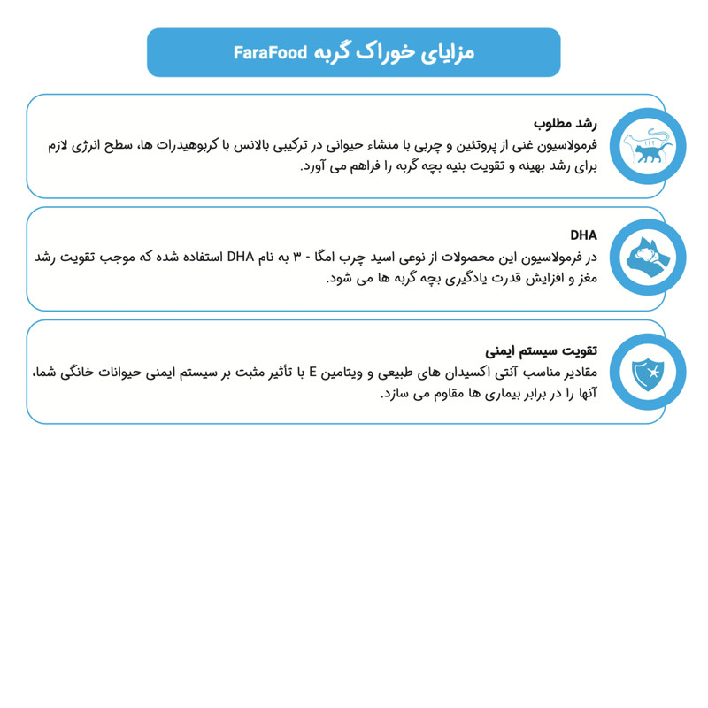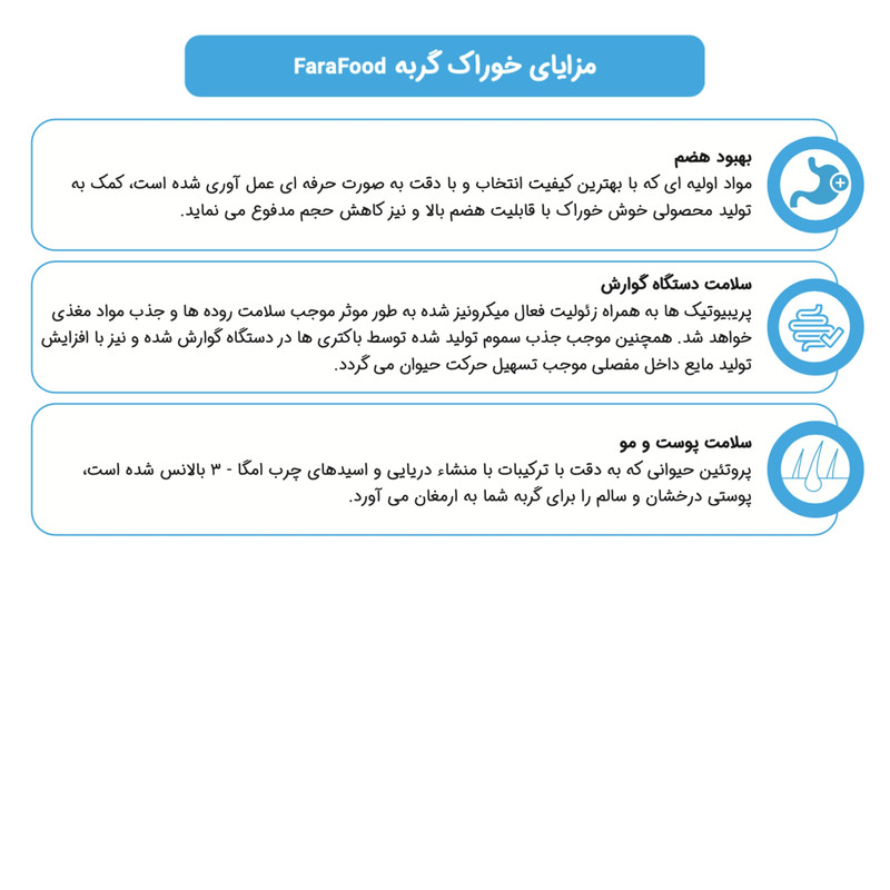 غذای خشک گربه بالغ فرافود مناسب برای تمام نژادها با تکهها ریز 9.5 میلیمتری شامل ترکیبات مقوی و لازم زیر است: