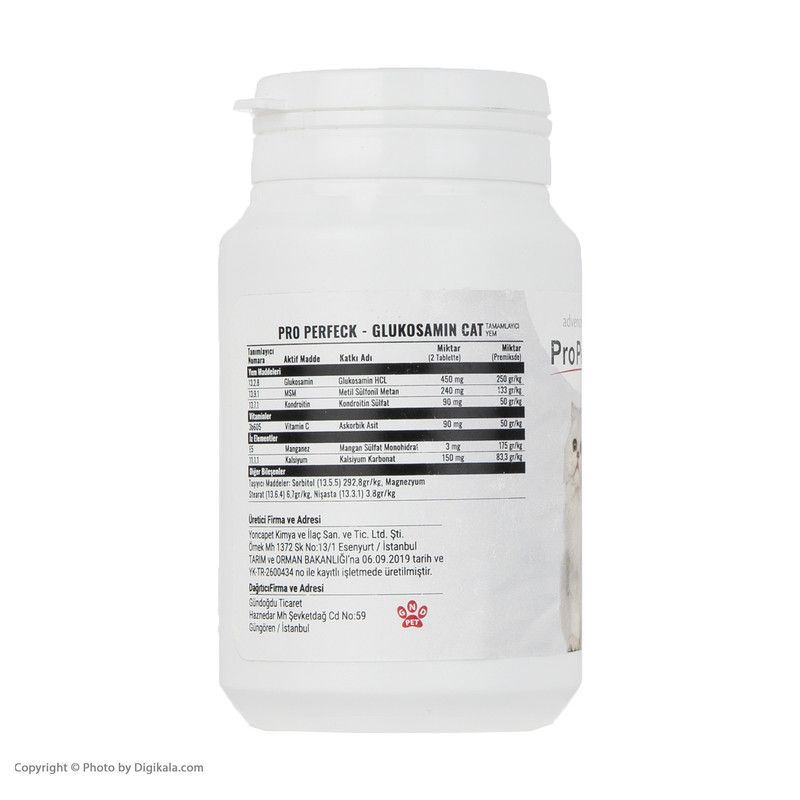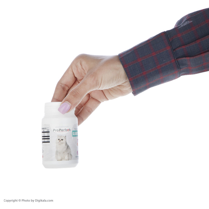قرص گلوکوزآمین پروپرفک مخصوص ساخت و تقویت غضروفهای گربه، حاوی ترکیبی از گلوکزآمین، کندروتین، MSM، ویتامین C، منیزیم و کلسیم است. با افزایش سن ظرفیت بدن در تولید مقادیر کافی گلوکز آمین و کندروتین کاهش می یابد و در نتیجه مفاصل در معرض آسیب بیشتری قرار میگیرند. از این رو استفاده از این ترکیب در سنین بالا برای گربه ها بسیار توصیه می شود. گلوکزآمین یک قند آمینی است که به طور طبیعی در بدن ساخته میشود و برای ساخت هیالورونیک اسید که مادهی اصلی تشکیل دهندهی غضروف است و سبب لغزنده بودن مفصل میشود بکار میرود. این ترکیب همچنین تولید مایع مفصلی را افزایش داده و از این طریق اثرات ضد التهابی خود را بر روی مفاصل اعمال میکند. گلوکز آمین نقش مهمی در حفظ حالت ارتجاعی تاندونها داشته و در نتیجه مانع از در رفتگی و آسیب استخوانها میشود. کندروتین نیز دارای اثرات سینرژیستی با گلوکوز آمین بوده با مهار آنزیمهای الاستاز و هیالورونیداز (که سبب تخریب غضروفها میشوند) انع از اسیب به غضروفها میشود. ترکیبات MSM موجود در این قرص موجب تسکین مفاصل فرسوده و دردناک، کاهش درد و التهاب استخوان و مفاصل، برطرف کننده خستگی و انرژی ضعیف، و بهبود روند انتقال اکسیژن در بدن گربه می شود.
