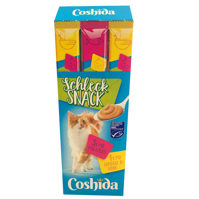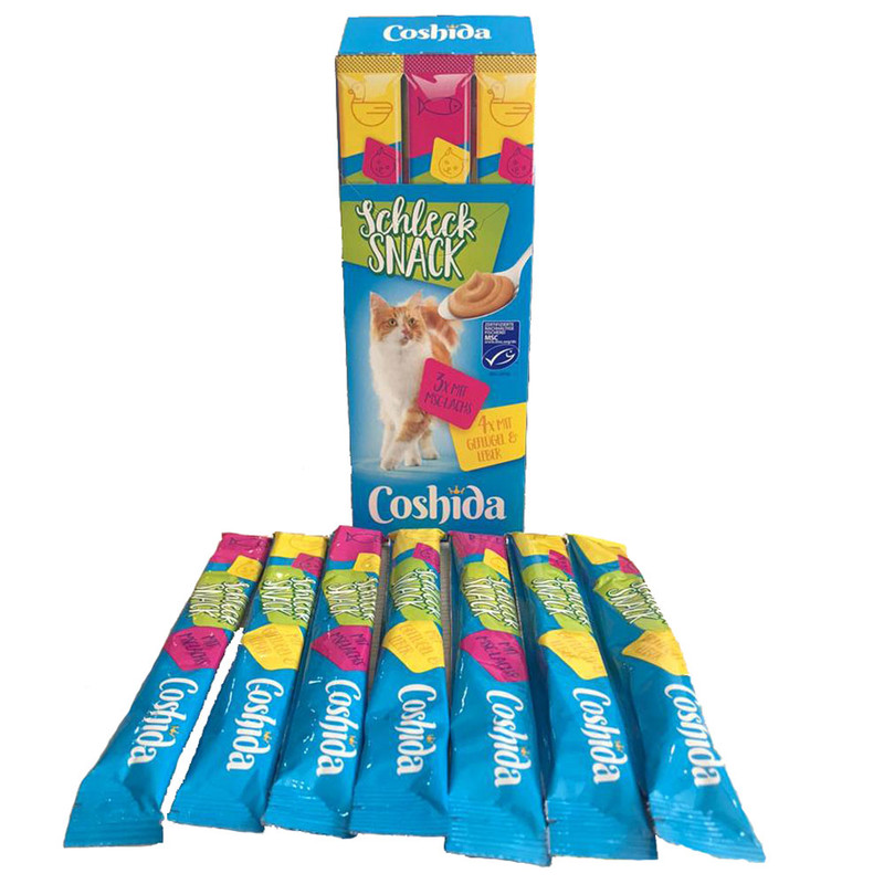 بستنی مخصوص گربه کوشیدا محصول کشور آلمان به عنوان یک میان وعده بسیار لذیذ شامل مجموع 7 عدد بستنی شامل 4 عدد بستنی با طم مرغ و جگر و 3 عدد بستنی با طعم ماهی سالمون می باشد که در داخل پک قرار گرفته اند