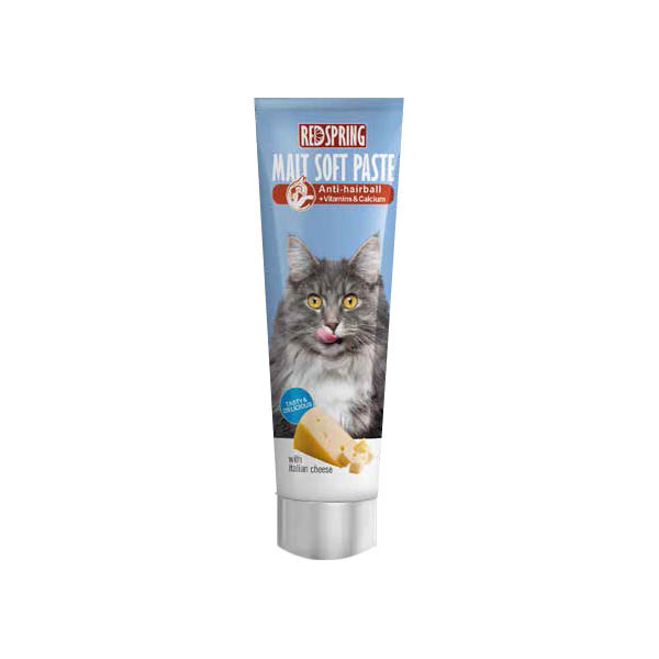 خمیر مالت red spring با اثر گزاری قوی، ضد گلوله ی مویی است . سلولز موجود در این خمیر پیشگیری کننده از تشکیل گلوله مویی و مالت طبیعی موجود در آن با تقویت ترشحات مخاطی دافع گلوله های مویی از سیستم گوارش گربه ها است.