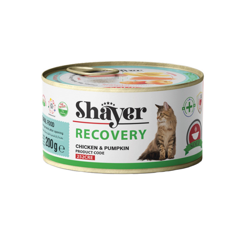 کنسرو غذای گربه شایر مدل ریکاوری با طعم مرغ و پامکین امولسیون خوش طعمی است که با طعم و بوی مورد علاقه گربه باعث تشویق پت شما به خوردن غذا میشود و همچنین کالری بالای غذا باعث ایجاد انرژی بیشتر در پت شما میشود. پروتئین بالا و ویتامین C موجود در غذا کمک شایانی در افزایش سلامتی پت شما دارد. همچنین از این محصول می توانید برای گربه هایی که کم فعالیت و ضعیف هستند و یا اشتها به غذا ندارند و دوران نقاهت و یا بیماری را می گذرانند در کنار غذای خشک و یا به تنهایی استفاده کنید تا تشویقی برای غذا خوردن پت شما باشد و به هضم و گوارشش کمک کند. محتویات: مرغ، برنج، سیب زمینی ، هویج، کدو حلوایی، آب گوشت.