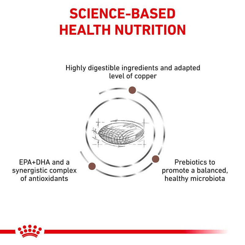 غذا خشک سگ رویال کنین مدل hepatic فرموله شده برای حمایت از عملکرد کبد در سگ های مبتلا به بیماری های مزمن کبدی همچنین منع تجمع مس در کبد و سلولها به واسطه کاهش سطح مس در ترکیب و حاوی پروتئین های گیاهی با قابلیت هضم و جذب بالا و مناسب با شرایط کبد حساس است.