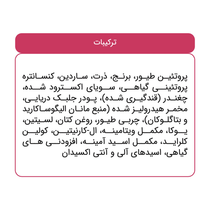 + فرمولاسیون مناسب: وجود مقادیر مناسبی از پروتئین ها، چربی، کربوهیدرات ها، ویتامین ها و مواد معدنی که در محصول استفاده شده است، موجب فراهم آوردن تمام نیاز های تغذیه ای حیوانات خانگی شما می شود.