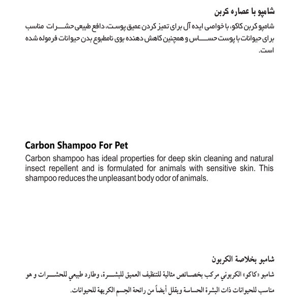 شامپو کربن کاکو، با خواصی ایده آل براي تمیز کردن عمیق پوست، دافع طبیعی حشرات مناسب و براي حیوانات با پوست حساس و همچنین کاهش دهنده بوي نامطبوع بدن حیوانات فرموله شده است.